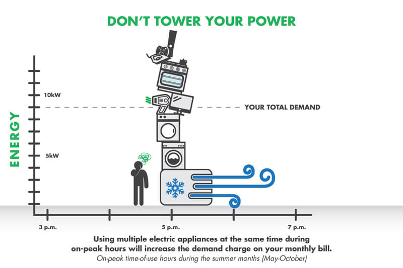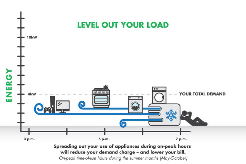 With Demand Time-of-Use, timing is everything. The more you are able to even out and shift your usage away from peak hours, the better off you’ll be. Your savings will vary based on your usage patterns.